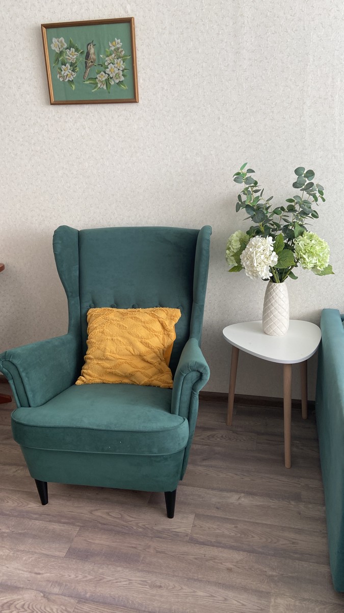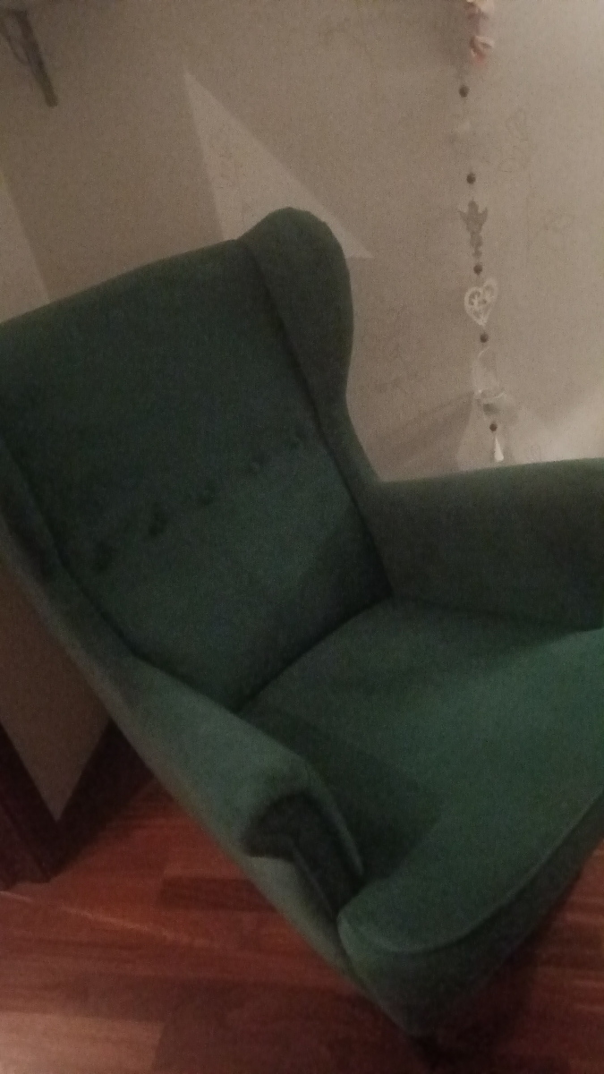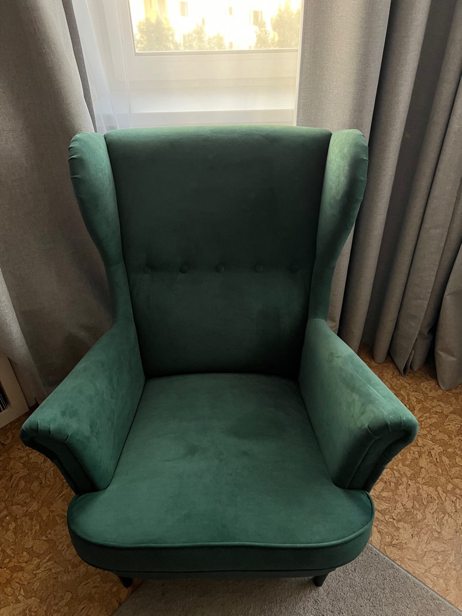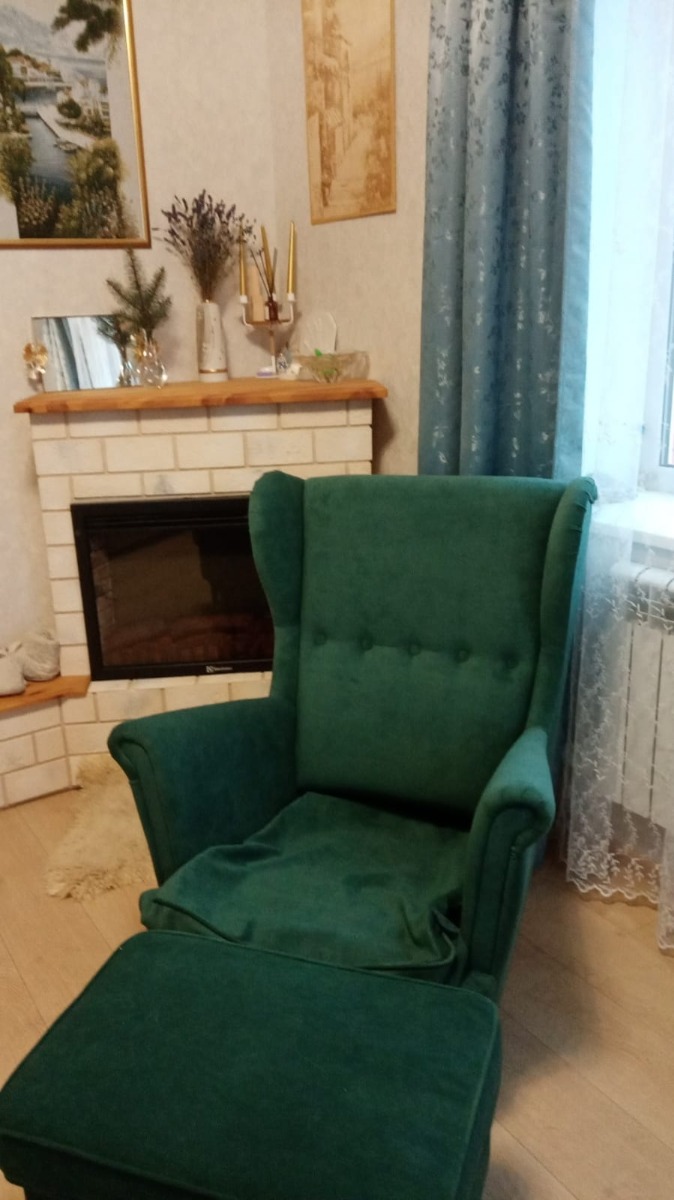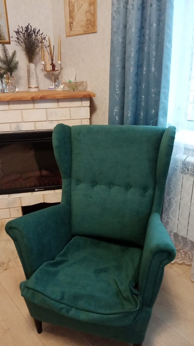 Добротное кресло, замена икеевскому. Материал - велюр. Цвет - малахитовый, в интерьере смотрится богато.