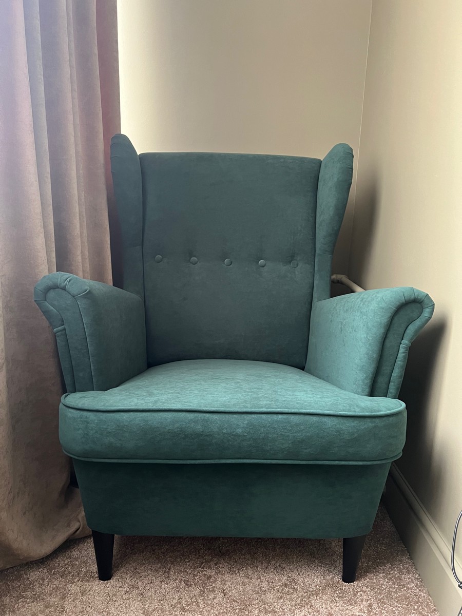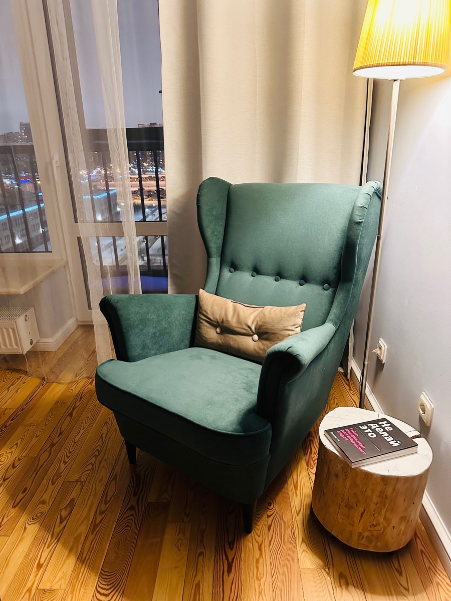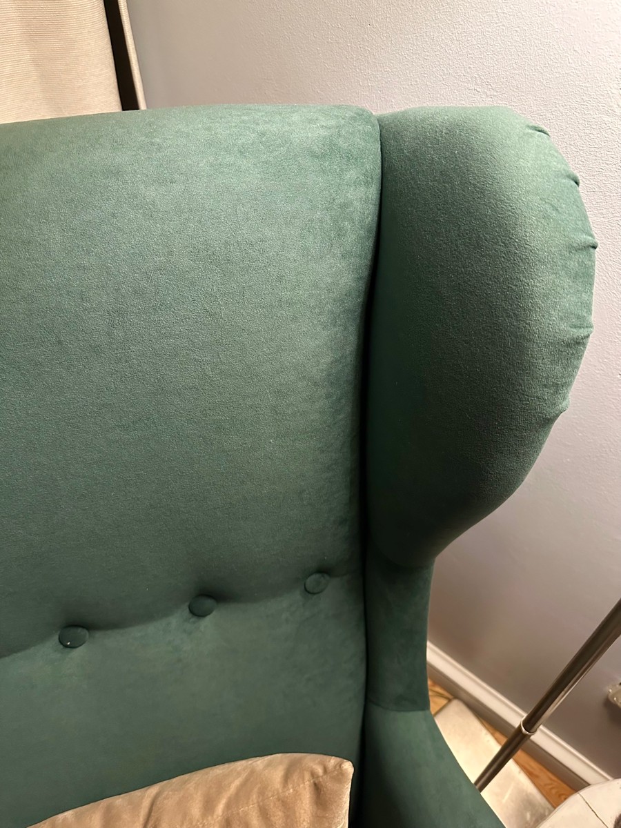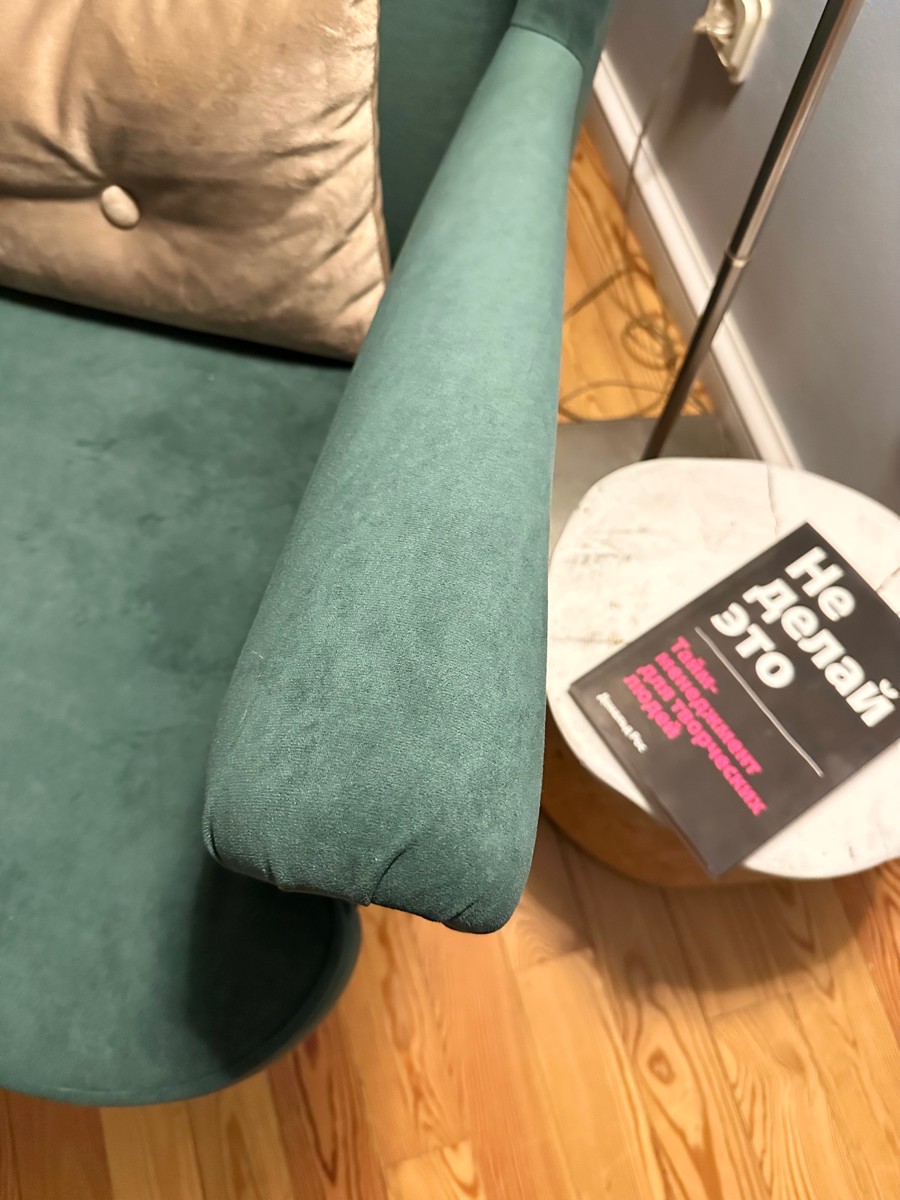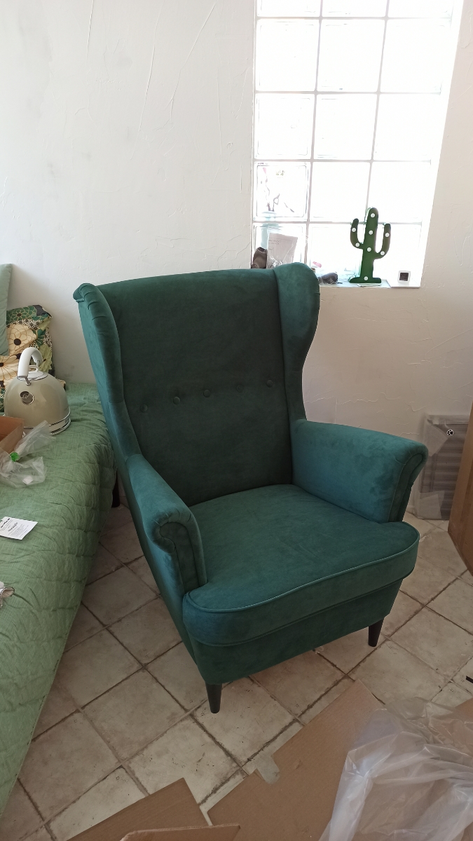 Добротное кресло, замена икеевскому. Материал - велюр. Цвет - малахитовый, в интерьере смотрится богато.